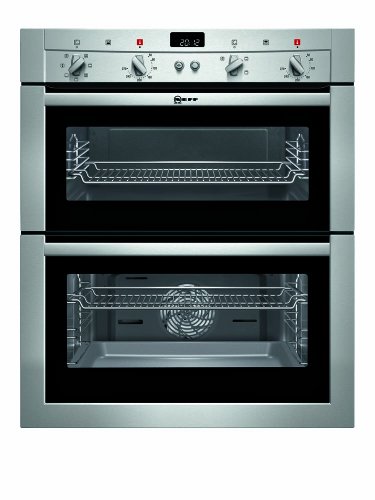 PRODUCT DESCRIPTIONS:This oven includes a Defrost programme and the powerful CircoTherm? technology, allowing you to cook a three course meal simultaneously with minimal or no preheating required. A great addition to any modern kitchen. Manufacturer: Neff Colour: Stainless steel Top and main oven features Features Silver display EasyClock QuickConnect shelf supports Framed glass inner doors Triple glazed doors Heat reflective glass Design Bevelled metal fascia Symmetrical design Bevelled oval controls Retractable controls 'U-form' door design Curved bevelled bar handles Standard accessories 1 full width enamel tray 1 high/low wire shelf 3 anti-tip flat wire shelves Optional accessories System steamer N8642X0EU Baking stone ? GN Ceramic dish, 38mm deep Z1665X0 ? GN Ceramic dish, 38mm deep Z1685X0 Top oven additional features Features 1 x 25 Watt lamp 2 shelf positions TitanEnamel CeramiClean® (back and roof liners) Performance/technical information 35 litre capacity Energy efficiency rating A Main oven additional features Features Automatic on/off programmer 1 x 40 Watt lamp 3 shelf positions TitanEnamel CeramiClean® liners (back, roof) Performance/technical information 50 litre capacity Energy efficiency rating A Total connected load 4.9KW