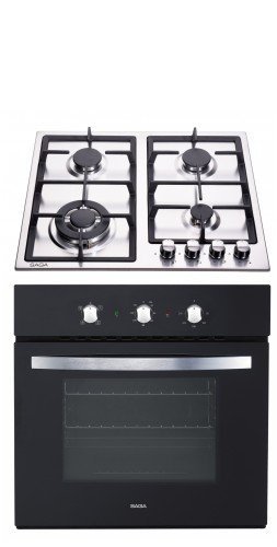 PRODUCT DESCRIPTIONS:Model : BSO650GL Features: · 6 functions fan oven with Mechanical control · Glass panel · Energy efficiency class: A · Oven capacity: 57 litres · Interior lamp: 1*25W · Thermostatically controlled grill ·Double-glazed removable door Standard accessories: · 1 pc oven rack · 1 pc bake pan · 1 pc rotisserie kit · Product dim.(H*W*D) : 595*572*595mm · Packing dim. (H*W*D) : 660*650*650mm · Net Weight : 31KG · Gross Weight : 34KGSaga Attic S641CI 60cm Built-in gas hob with electronic ignition, flame safety device on each burner and cast iron pan stands